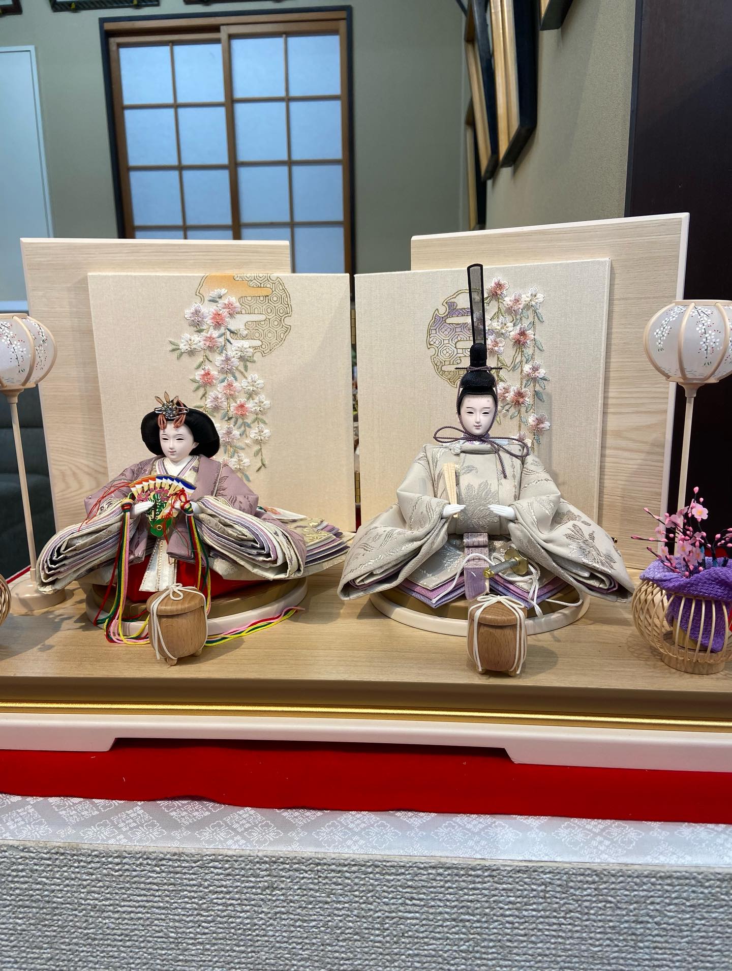 小さめのお雛様です。素敵な色合いのお雛様で、刺繍の屏風に合わせました。お顔も美男美女!